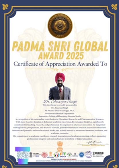 Dr. Amarjeet Singh, Professor and Head of Department at Innovative College of Pharmacy in Greater Noida, has been awarded the Padma Shri Global Award 2025 for his remarkable contributions to teaching, research, and pharmaceutical sciences. With more than 20 years of academic experience, he has made major contributions to teaching, research publishing, student mentoring, and academic leadership. This renowned award recognizes his dedication to academic success and adds pride to the university.